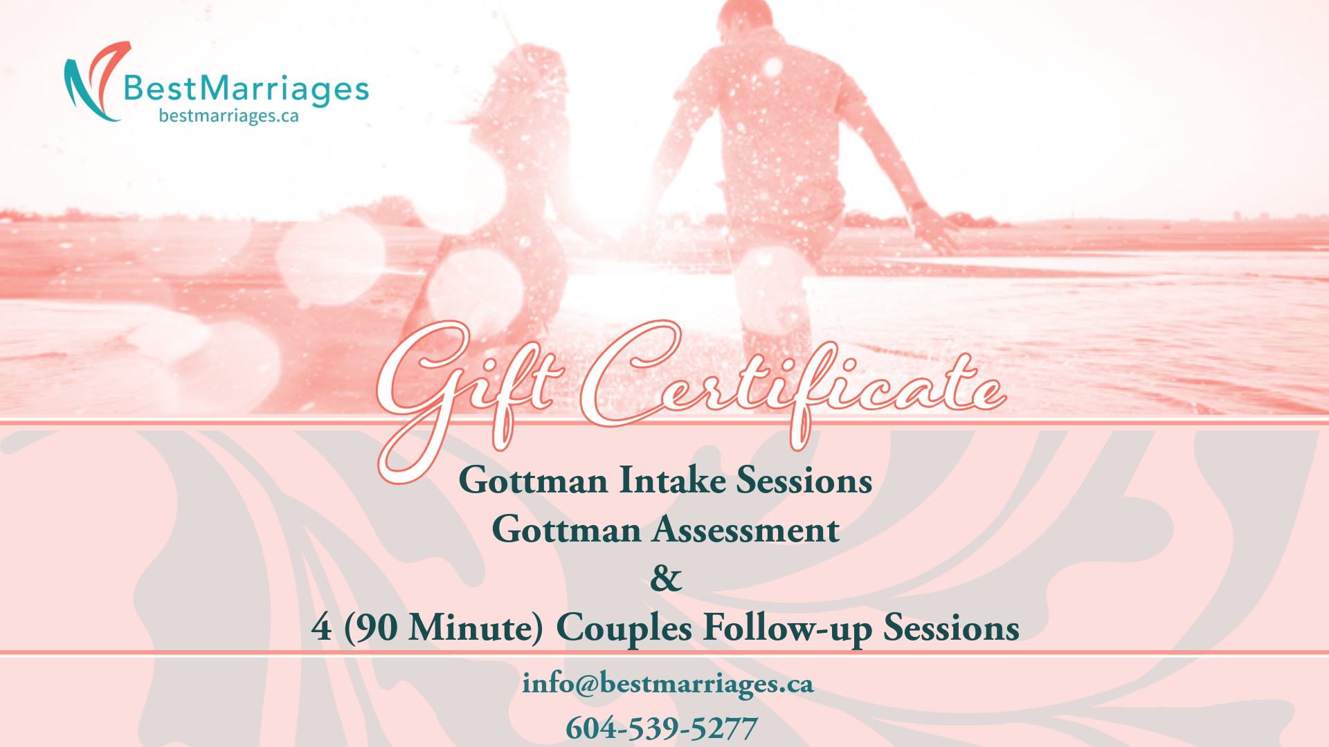 Gottman Intake Sessions ( First Couples Session, 1 Individual Session per Person in Relationship and Couples Feedback Session) plus a Gottman Assessment and 4 Couples Follow-up Sessions